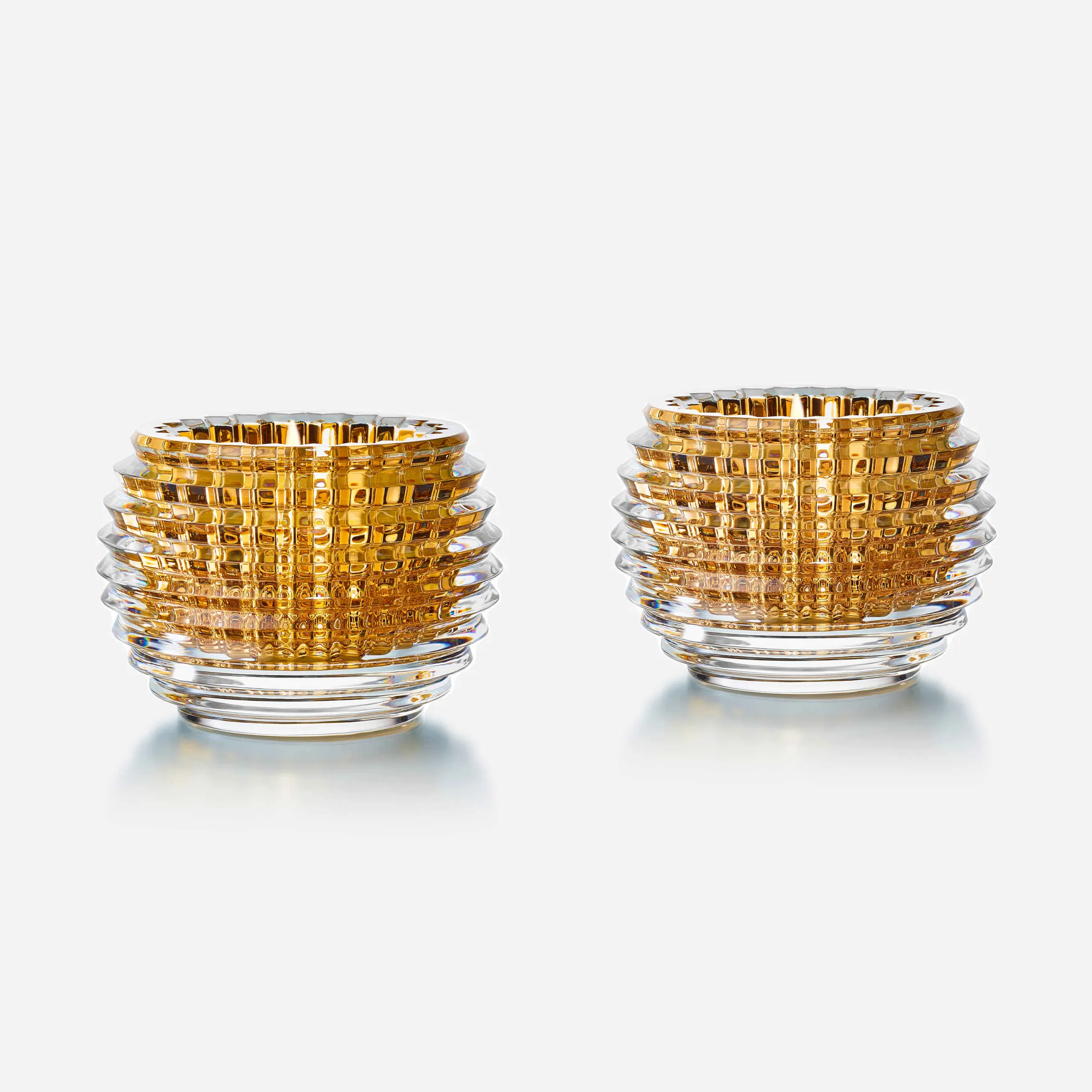 The Eye Candle-Jar in Baccarat crystal exudes an extraordinary play on light thanks to the exceptional cut. Available in clear, red and gold, the Eye candle-jar brilliantly reflects candle-light. Fashionable colours make this a modern piece with unmatched technical sophistication. The collection features horizontal exterior cuts and vertical interior cuts and is also developed into rectangular and oval vases.