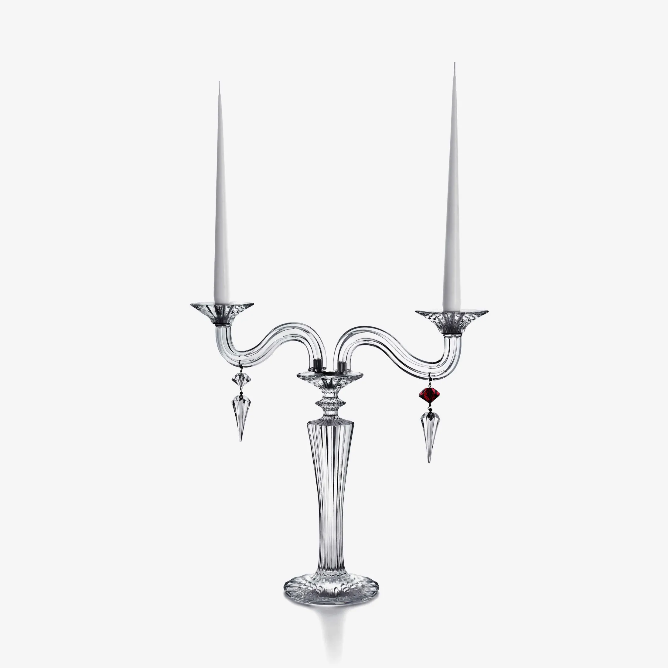 The baroque spirit of the Mille Nuits candelabra expresses all the allure of the Orient. The bevel-cut arms of the candelabra, amidst which stand two decorative crystal swirls, glitter luminously. Each candelabra arm is adorned with dangling arrowhead-shaped crystals that catch the light in a scintillating manner. Candles nestle within crystal candleholders shaped like blooming daffodils. The Mille Nuits candelabra is a sumptuous item, made in two-, three-, or five-light versions; also available in gold. Hurricane shades, available separately, emphasize every candle flicker and intensify the luminosity. Designed for Baccarat by Mathias, Mille Nuits is a reference to the 1001 Tales of The Arabian Nights. The Mille Nuits collection also encompasses chandeliers, stemware, and home décor.