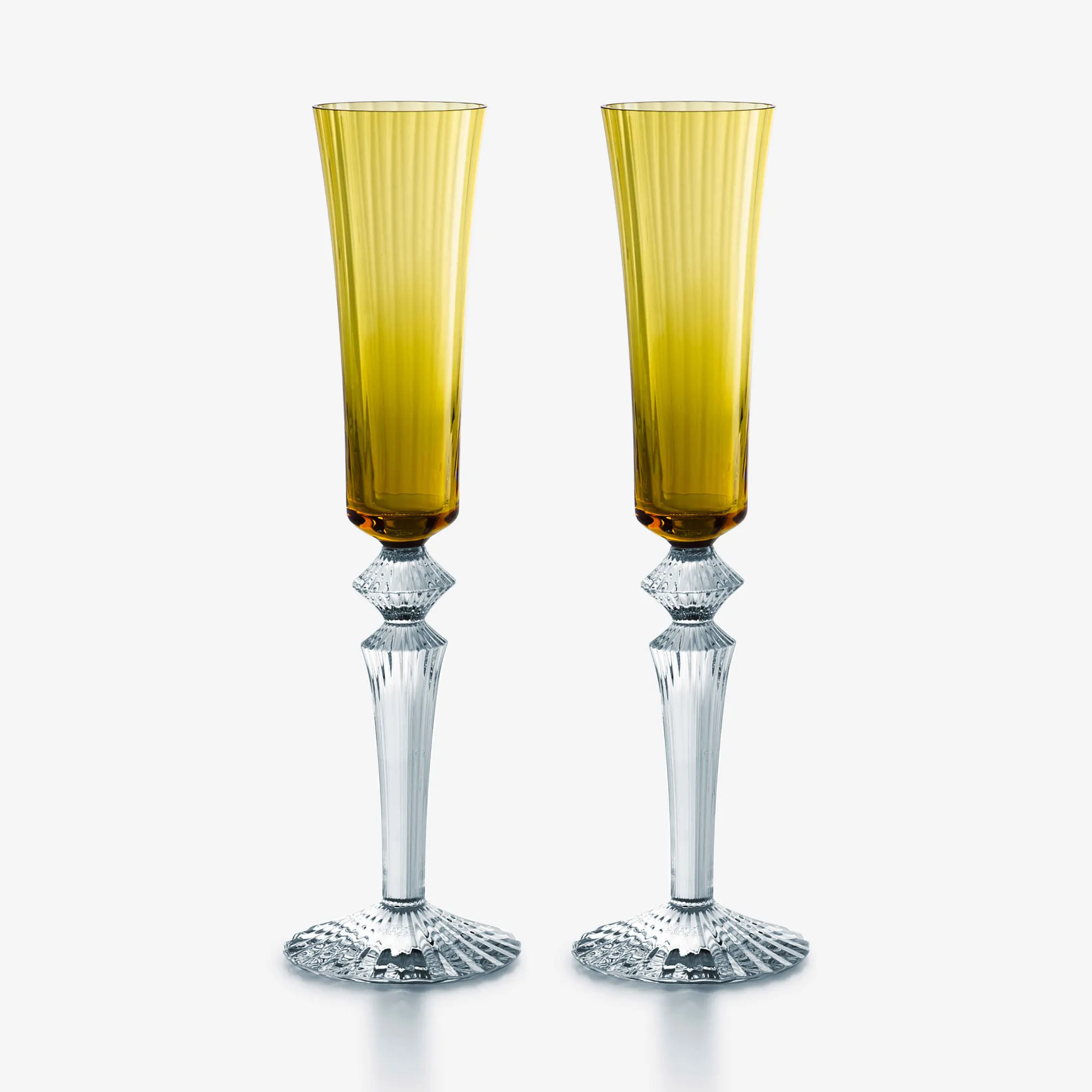 The Baccarat Clear crystal Flutissimo is designed by Mathias as part of Baccarat’s Mille Nuits collection. The name Mille Nuits is a reference to the 1001 Tales of The Arabian Nights and to the world of the Orient. The –issimo suffix emphasizes the design’s overall sleekness. The smooth narrow bowl contrasts with the intricacy of the beveled stem: the detailing travels all the way down to the ridged foot. The two halves are united by the elegant diamond-shaped center, which is the Mille Nuits signature. In addition to the Clear crystal, the Flutissimo is also available in a variety of vivid colors.