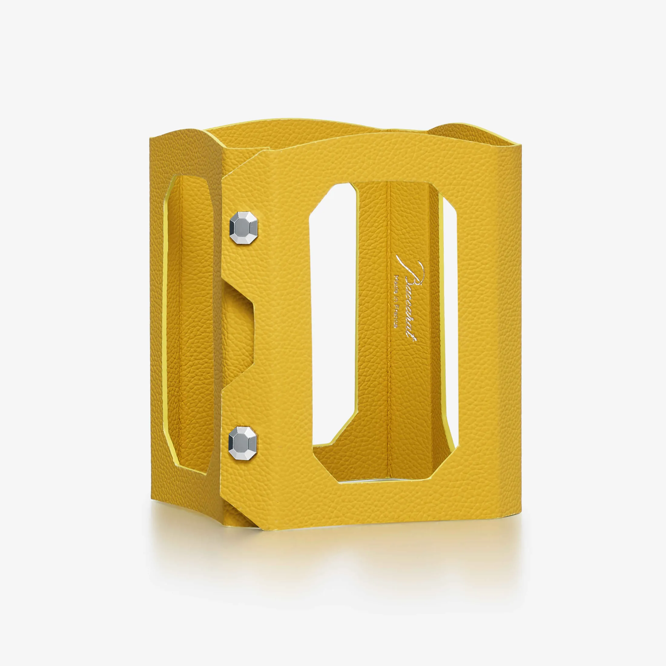 The Art of Tasting in Style. Baccarat reimagines its iconic decanters with a refined leather case designed to elevate every tasting ritual. Crafted like a second skin, the Octogone case wraps the square-shaped Harmonie, Harcourt, and Harcourt Empire decanters with bold elegance. A couture piece, tailor-made to reinvent the art of tasting. The interplay between leather and crystal enhances the geometric lines of the decanters, lending them a distinctly modern aesthetic. Four vibrant shades — red, camel, yellow, and teal — allow for personal expression through a luminous, elegant palette. Hand-painted edges in contrasting tones introduce a striking graphic detail. Every element subtly echoes the heritage of the Maison. Four octagonal cut-outs, inspired by Baccarat’s signature chandelier pendant, offer glimpses of the amber hues within — a discreet promise of what lies inside. Two raised, octagon-shaped snaps seal the case with precision. A refined layer of protection, a bold statement, and a play of materials and light — the spirit of Baccarat captured in an exceptional accessory.