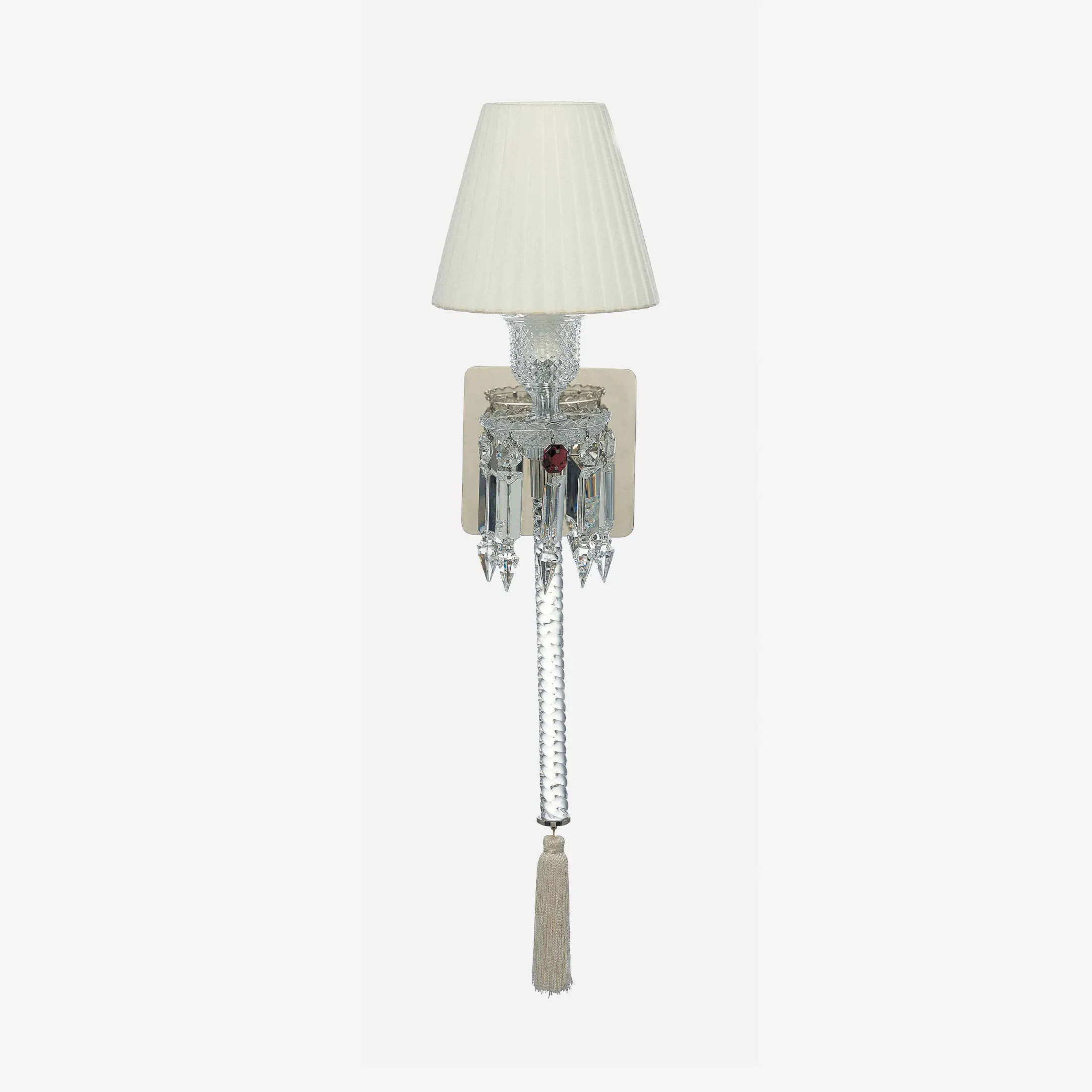 Designed by Arik Levy, the Torch wall lamp topped by a lampshade with pleated taffetas was inspired by the emblematic Zénith chandelier, which it partly reinvents. The combination of crystal and metal adds a touch of modernity.
