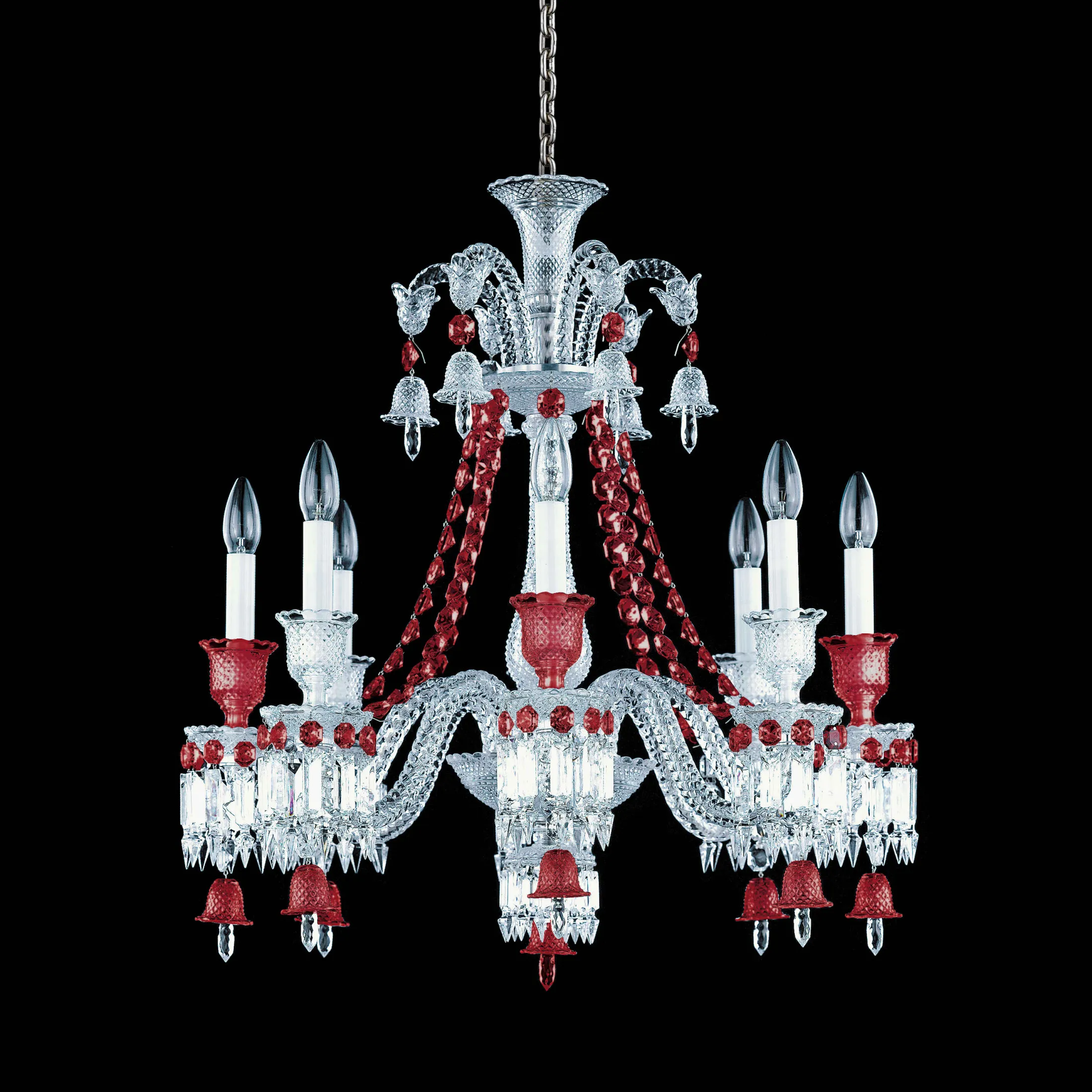 This chandelier, whose architecture is strictly identical to the clear Zénith one, is revealed under a new light thanks to its suit of golden red crystal, iconic of Baccarat, which magnifies its ornamentations.