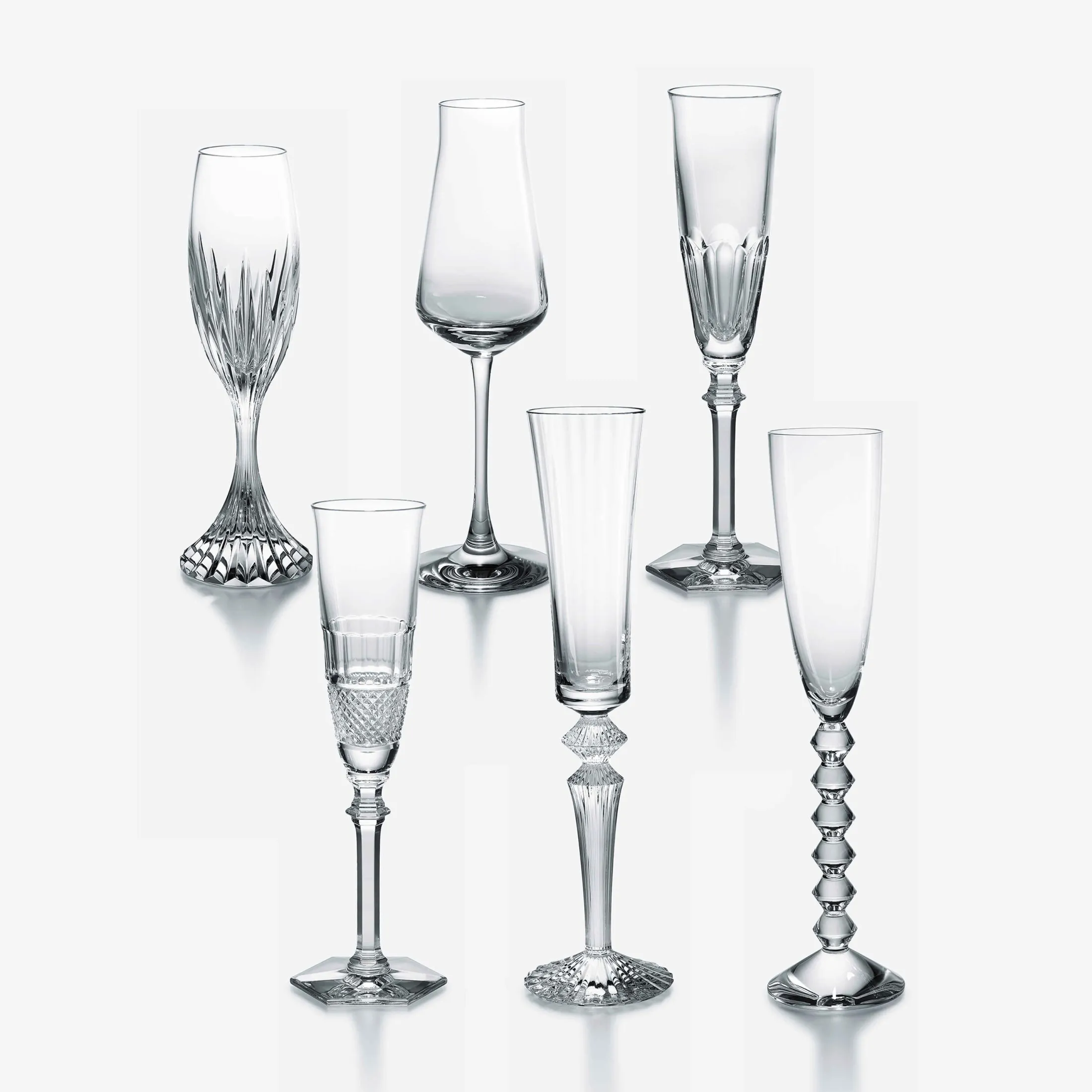 For night-owls and party lovers, Baccarat has dreamed up an exceptional set of six champagne glasses. Champagne, Royal Mojito or Bellini, amaze your guests and give your parties a real buzz all night long. The ideal gift to add a little sparkle to life. This box contains 6 flutes: a Mille Nuits 2810597, Vega 2811802, Harcourt Eve 2802588, Diamant 2807400, Château Baccarat 2611149 and a Massena 2811797.