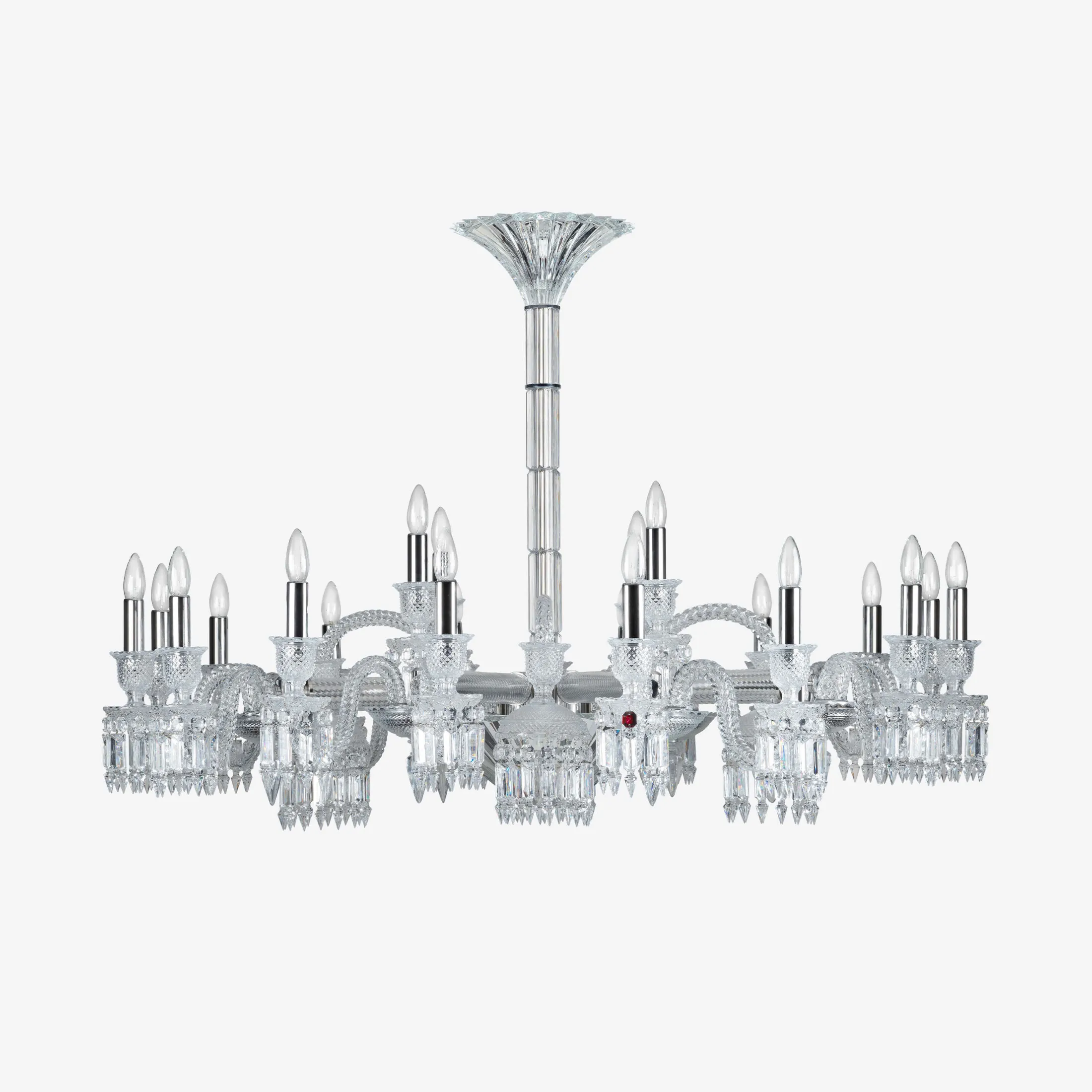 The interior designer and decorator Stéphanie Coutas presents a novel approach to Baccarat lighting. A subtle combination of modernity and heritage icons. Lampshades sold separately. Inspired by the Maison specific codes, interior designer and decorator Stéphanie Coutas has ventured to blend different components from emblematic collections: the diamond point of the Zénith chandelier, the twisted arms of the Solstice and the Venetian style of Mille Nuits imagined by designer Mathias. Wholly original in terms of size, the chandelier fits every interior. Authentic luxury adapted to today’s art of living.