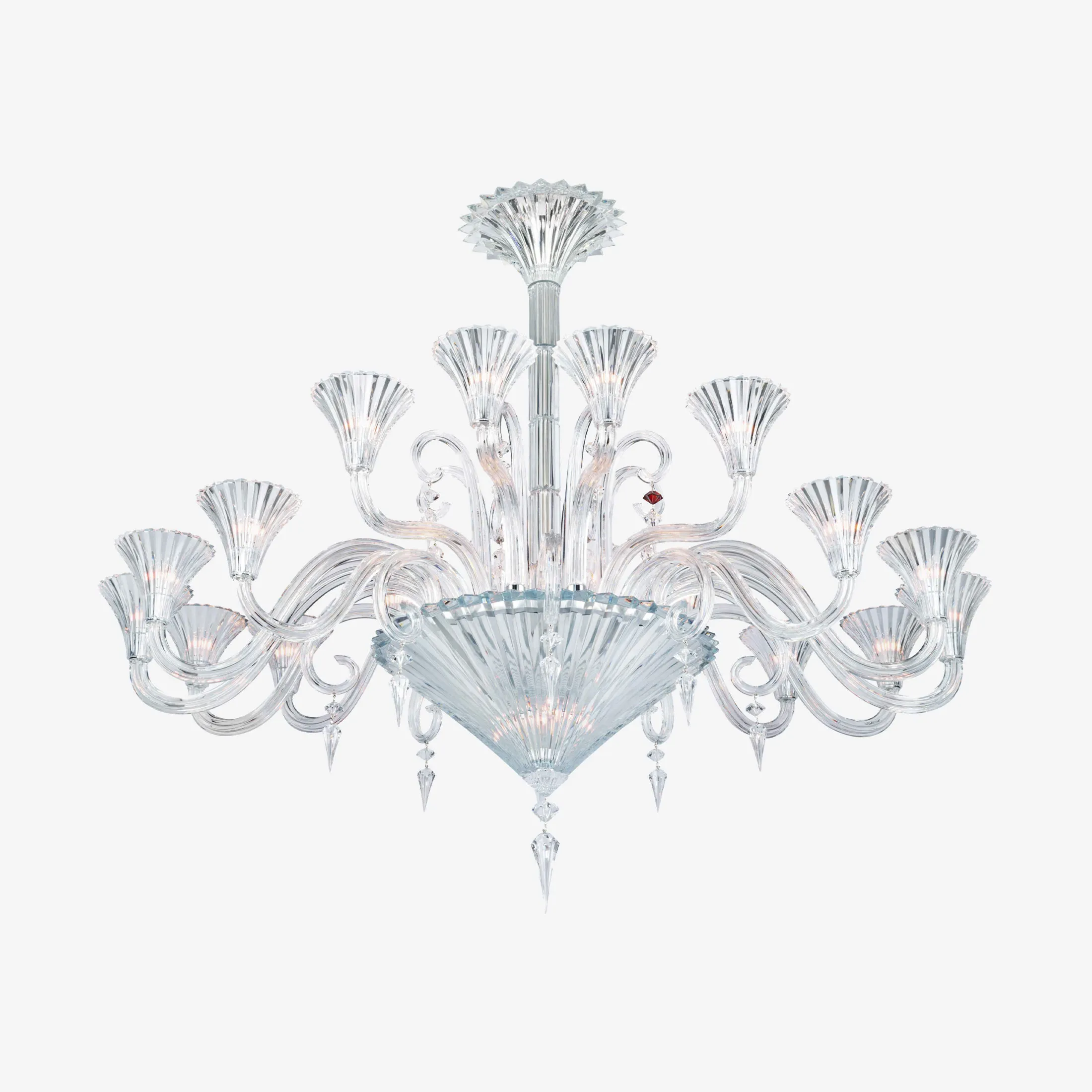 Iconic piece of Baccarat, the Mille Nuits chandelier designed by Mathias transforms into an undulating oval version to be integrated into new universes. With its venitian cut elements, the Mille Nuits collection evokes the baroque refinement of Persian legends and the splendor of the Thousand and One Nights palaces. With this new composition of chandelier branches of different sizes, the Mille Nuits chandelier will perfectly decorate a living room or a dining room, placed above a rectangular or oval table. The hand-cut central large bowl is also illuminated from the inside, creating an atmosphere of special magic.