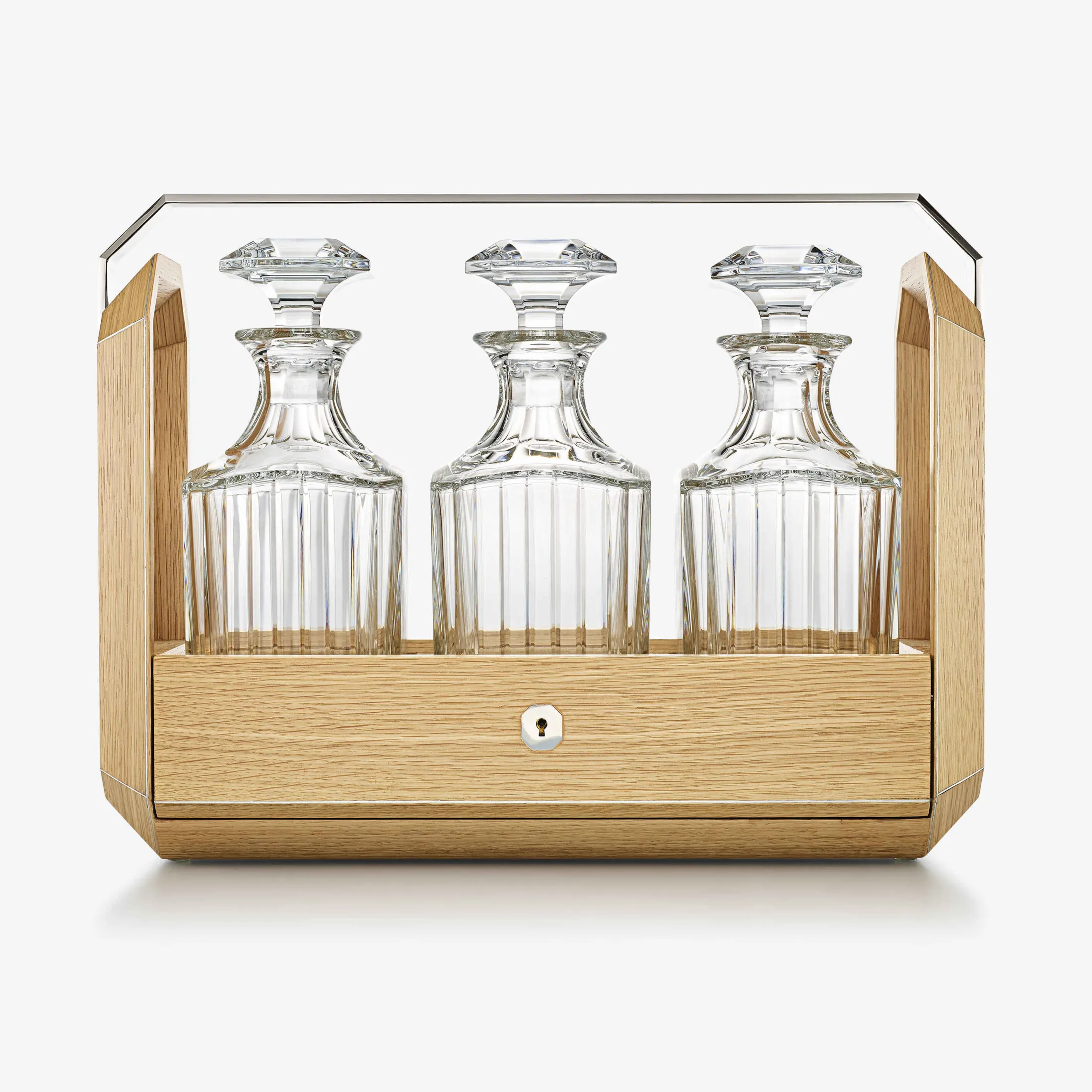A timeless symbol of Baccarat, the octagon is reimagined, leaving its mark on the Baccarat barware universe with new refined creations featuring a bold, graphic aesthetic. The Tantalus Octogone enriches the world of Baccarat Barware with a distinctive presence. Its design echoes the first liquor cabinets and tantalus cases crafted by the Maison in the XIXth century. Ingenious and refined, the piece puts the finest decanters and spirits on display, while keeping them secured under lock and key. Now reimagined, it seamlessly blends heritage and modernity, infusing the art of tasting with a bold spirit. Designed to hold and showcase three iconic Baccarat crystal decanters—Harcourt, Harcourt Empire, and Harmonie—the Tantalus Octogone combines the noble warmth of oak with the sophisticated brilliance of mirror-finished stainless steel. Its octagonal lines, precise and graphic, give it a powerful silhouette. Every detail reflects exceptional craftsmanship: contours with hand-inlaid pewter accents, an interior lined with beige Alcantara, and a lock and key sculpted in the shape of an octagon. A true statement piece, the Tantalus Octogone by Baccarat adds a touch of elegance to a private study, office, or lounge, where it captivates the eye and embodies a surprising tasting ritual.