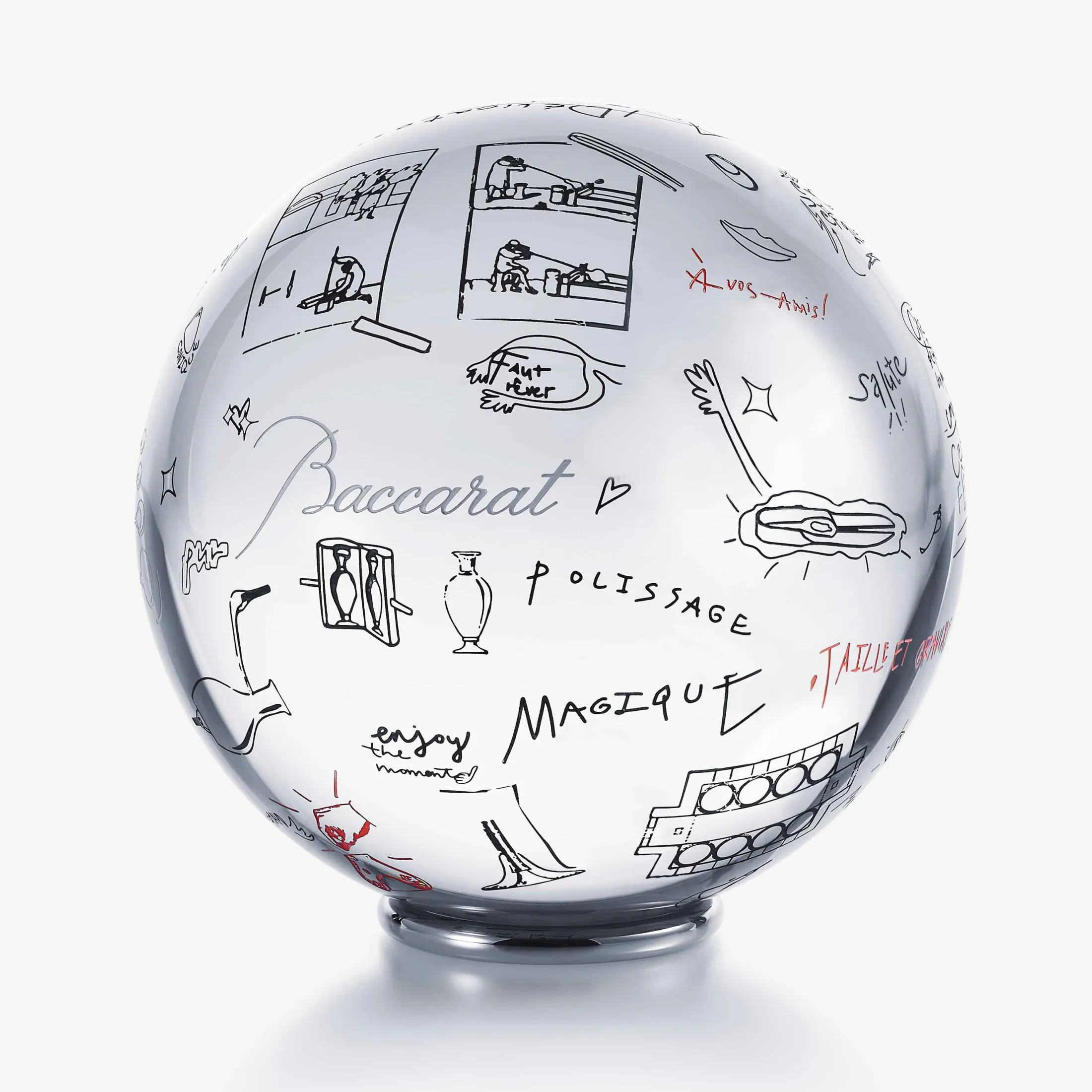 Harry Nuriev revisits the Harcourt tumbler and carafe, and the Sirius crystal ball, using the same graphic language he did for the Maison Baccarat entryway installation. Harcourt, the Baccarat icon, and Sirius, a symbol of the purity of crystal, become new means of artistic expression through his eyes. In the gilding ateliers of the Manufacture, artisans bring his vision to life, engraving and enameling, in black or in color, words such as salute, enjoy the moment, celebration, charm, alongside patterns and depictions of gestures symbolic of the Baccarat universe. Between heritage and reinvention, Harry Nuriev celebrates the Maison’s creative freedom and pays tribute to the savoir-faire of its collective, making emotion visible, and precious.