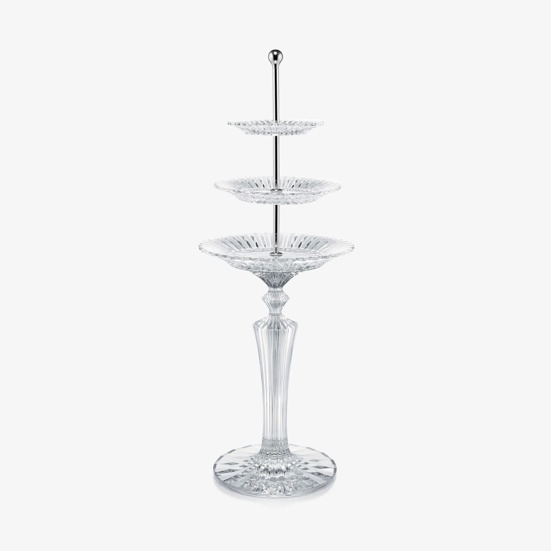 This Pastries stand is made of a crystal clear leg surmounted by a metallic tray so as to get a very stable Pastries stand. It has a chromed metallic hook system that let the users insert the stem in the marble. It permits the steadiness of pastries stand on his leg. There are 3 crystal clear tiers on the stem. The crystal legs give the Pastries Stand a new luxury touch. It becomes a new outstanding home accessory. It also lets the users elevate their Pastries. It facilitates the use and give a new poise to tea-times, desserts or afternoon treats by enhancing the nice cakes and pastries presented. This is a complementary offer in the Mille Nuits collection created by Mathias, which rimes with sophistication, dreams and baroque.