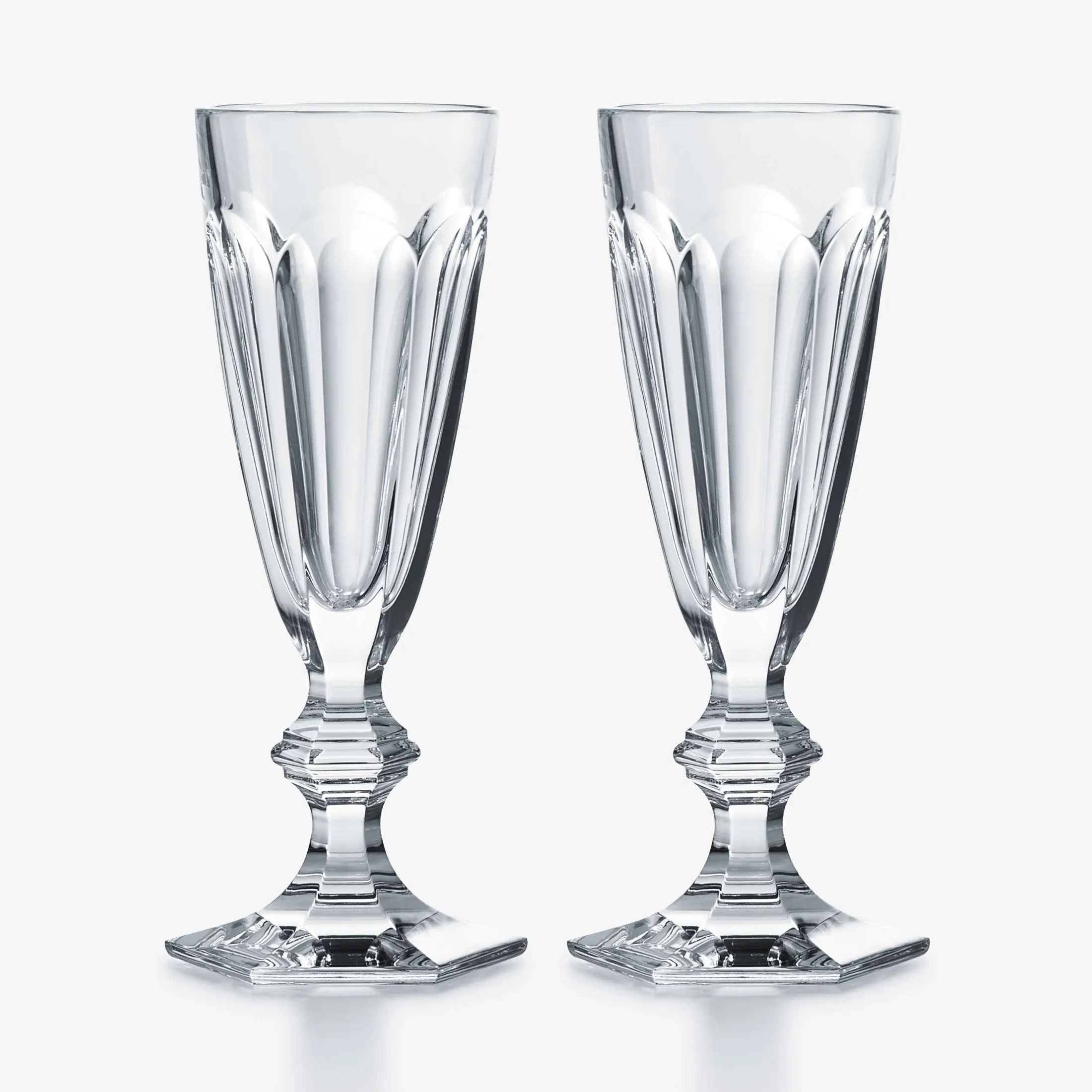 The Harcourt 1841 collection, the oldest in the Baccarat archive, is reputed for its iconic design. Since its creation in 1841, Harcourt 1841 stemware has been selected by Pope John-Paul II, the Queen of Thailand, the King of Morocco, and many other important figures. The Harcourt 1841 collection has also been a staple of French power, used during the age of Napoleon III to the contemporaneous Palais de l’Elysée. The Harcourt 1841 champagne flute is notable for its architectural form. Baccarat’s craftsmanship is apparent from every angle: the geometry of the bowl’s flat cut sides echoes that of the beveled stem and hexagonal foot. Sipping from a Harcourt 1841 glass is taking part in Baccarat’s storied and elegant past. A Harcourt 1841 tall champagne flute with a slightly narrower silhouette is also available.
