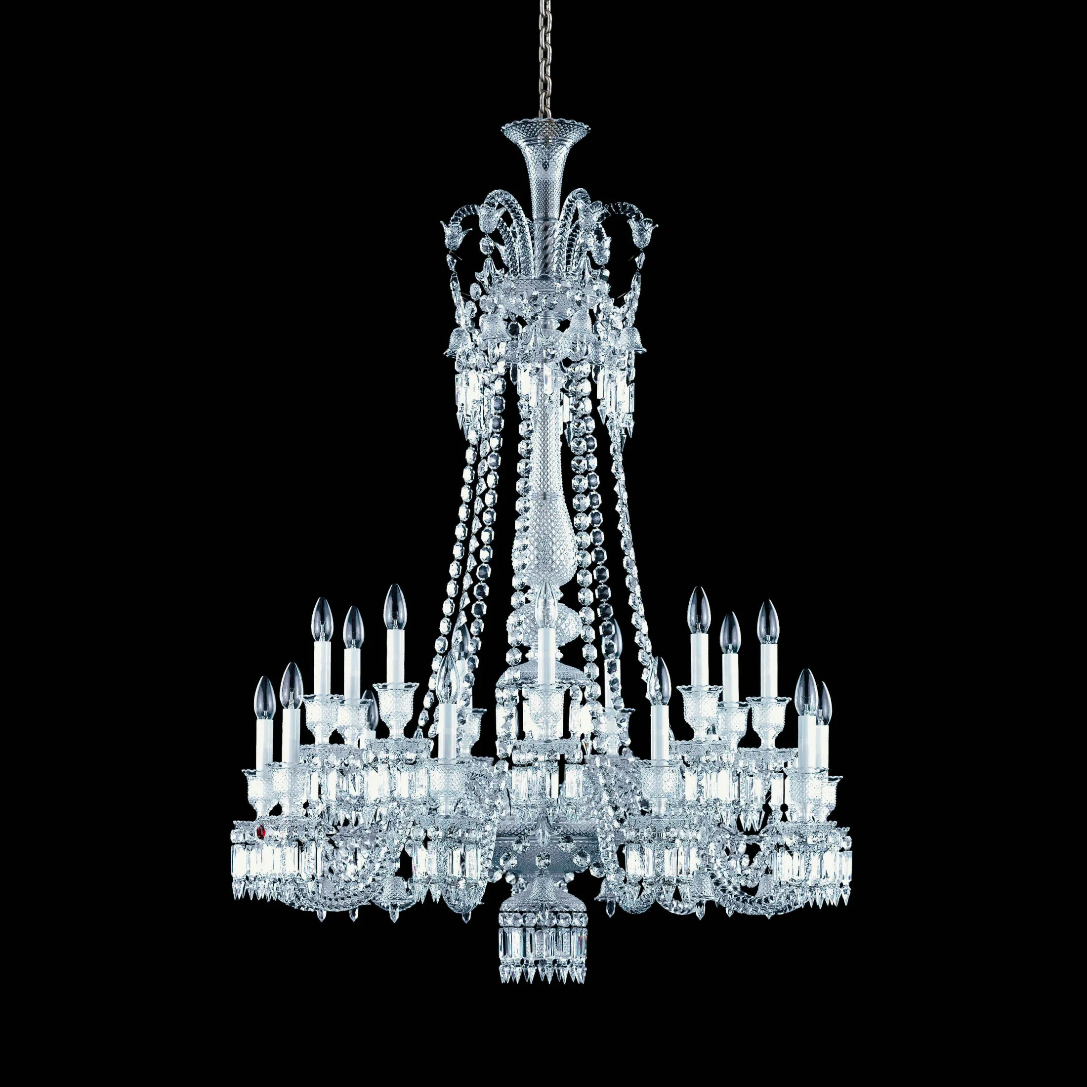 The chandelier is a truly dazzling decorative piece the luminous Clear crystal a revelation sculptural splendor. The composition of this chandelier may range immensely from 6 to 48 lights. Regardless of scale, the chandelier has a central column of cut crystal that resourcefully masks all functional cables. The wealth of ornamentation is enthralling, festooned with chiseled prisms, sparkling pendants, and Baccarat’s signature single red octagonal crystal hung discreetly. The chandelier may be displayed with white taffeta shades (must be ordered separately) for added majesty, and a long version of the Zenith chandelier is also available.