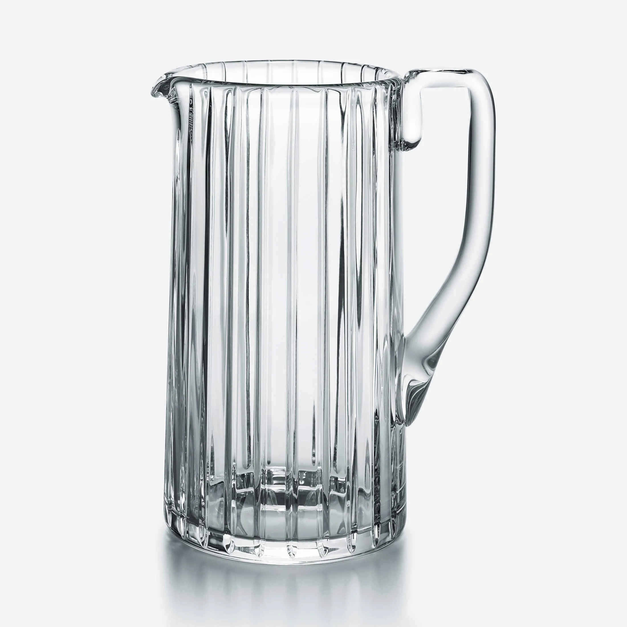 This Baccarat Clear crystal Harmonie pitcher has a streamlined silhouette and an elegantly curved handle and spout. Parallel vertical lines travel cleanly along the silhouette finely grazing the Clear crystal form from the lip to the base.This linear emphasis evokes a thick Clear crystal column.The stripes are subtly yet precisely etched into the Clear crystal surface, showcasing the three-dimensionality of the pitcher and creating a visual depth to the liquid within. The vertical sweep of the striping is present throughout the Harmonie collection, which includes highballs and tumblers and other pieces to complete a well-stocked bar. The Harmonie pitcher is a stunning item that makes having a drink all the more enjoyable. Harmonie is the collection for creative cocktail enthusiasts and lovers of rare whiskies.