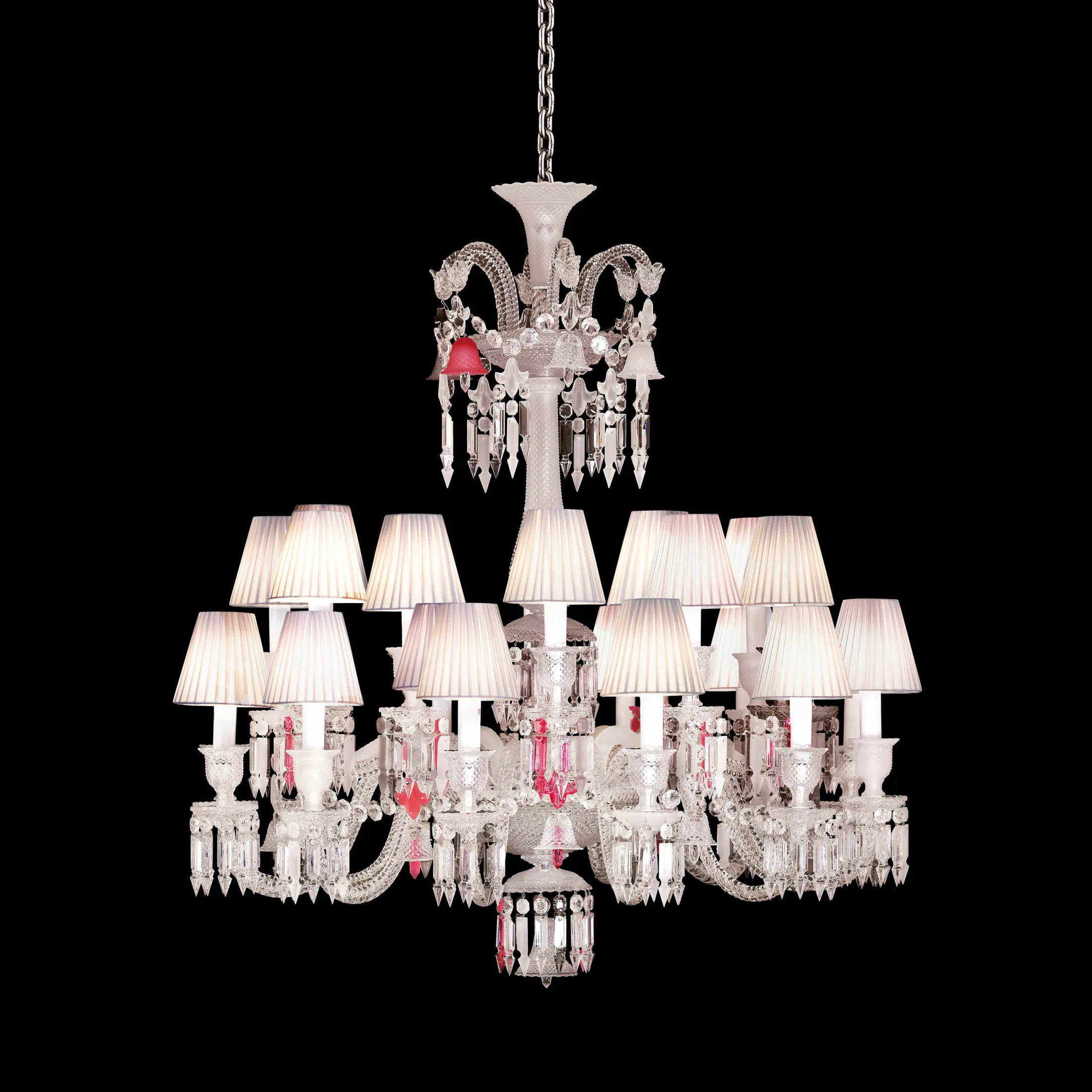 The Flou je te vois flou Zenith chandelier was displayed for the first time at the Maison Baccarat boutique in Moscow, Russia. The resplendent design, whimsically conceived of by the ever-inventive Philippe Starck, mixes clear crystal, pink crystal and mist crystal alongside frosted ornaments. This particular color concept makes the Baccarat chandelier appear “unfocused”, evoking the effect of an out-of-focus camera lens, which in turn creates a stunning optical illusion. A romantic and poetic reinterpretation of Baccarat’s iconic Zenith chandelier, the “Flou je te vois flou” version also boasts a simplified silhouette. By suppressing most of the chains, the chandelier appears to possess a wonderful lightness. Also offered in black, the Flou je te vois flou Zenith chandelier is available by special order.