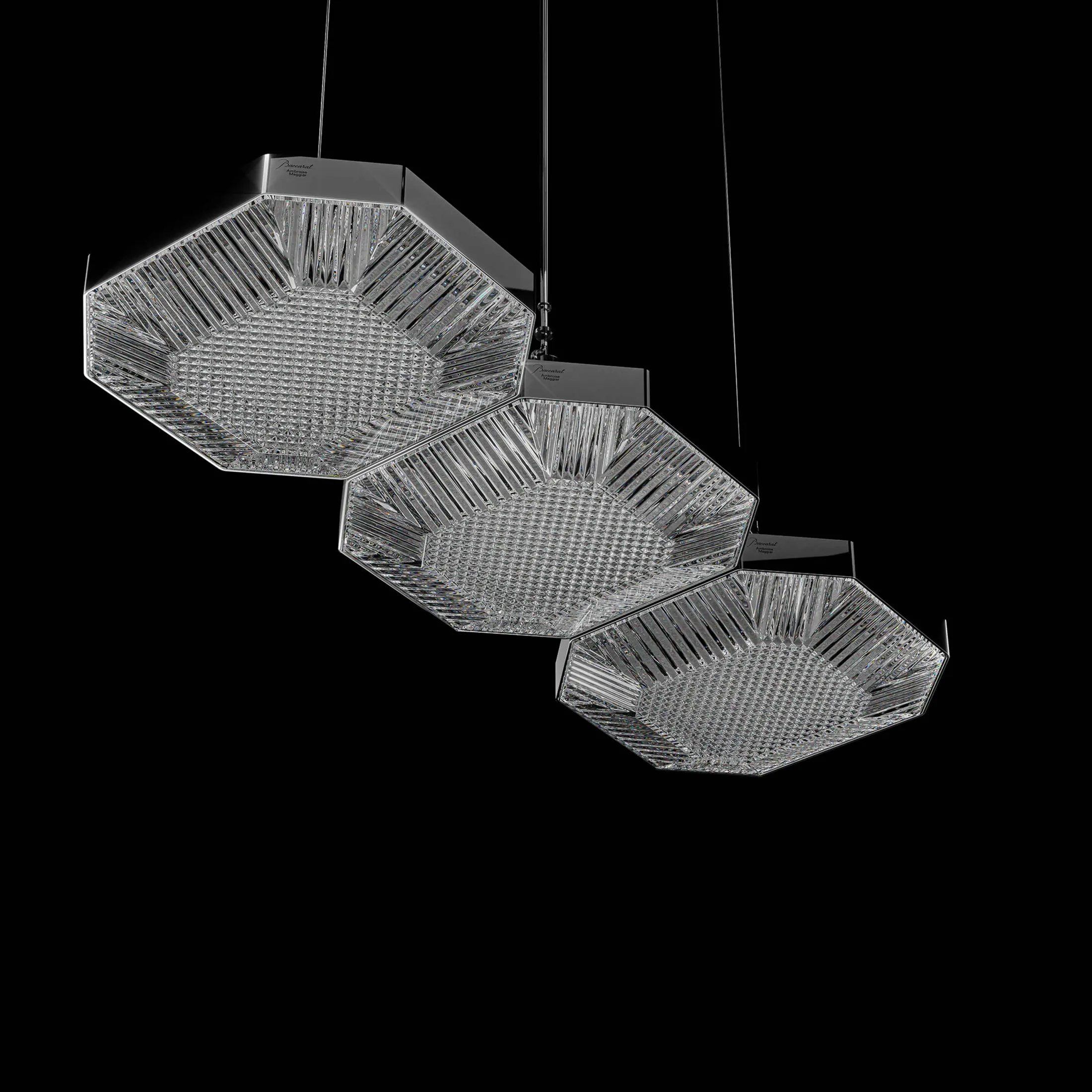 “Octogone is an architectural creation that celebrates the heritage of Maison Baccarat. A journey from earthly to celestial, where the radiance and purity of crystal are transcended by light.”- Ambroise MaggiarThrough the Octogone lighting collection, imagined by designer Ambroise Maggiar, Baccarat reinterprets one of its most iconic symbols: the octagonal pendant, a signature of its chandeliers for generations.A multidisciplinary designer, Ambroise Maggiar combines poetic sensitivity with methodical precision to create unique pieces that fuse heritage and innovation. Minimalist and avant-garde, the Octogone collection is a tribute to creativity offering limitless modularity. Conceived to adapt to any space, it can be displayed with playful freedom. As a ceiling lamp, wall unit or ceiling unit, with 1 or 3 light sources, the elements can be combined to the heart’s desire, giving rise to personalized compositions. Each piece, intricately cut with subtle patterns, sculpts the light and reveals a captivating play of reflections. Paired with crystal, the mirror-polished metal highlights the octagonal silhouette in striking contrast.Born in the XIXth century, Baccarat’s octagonal pendant has been continually reinvented over the years. Transformed into a light fixture, it embraces the XXIst century with boldness, embodying a resolutely contemporary art de vivre.Using the Casambi app, available on smartphone, LED intensity and temperature can be adjusted to create a personalized lighting atmosphere.