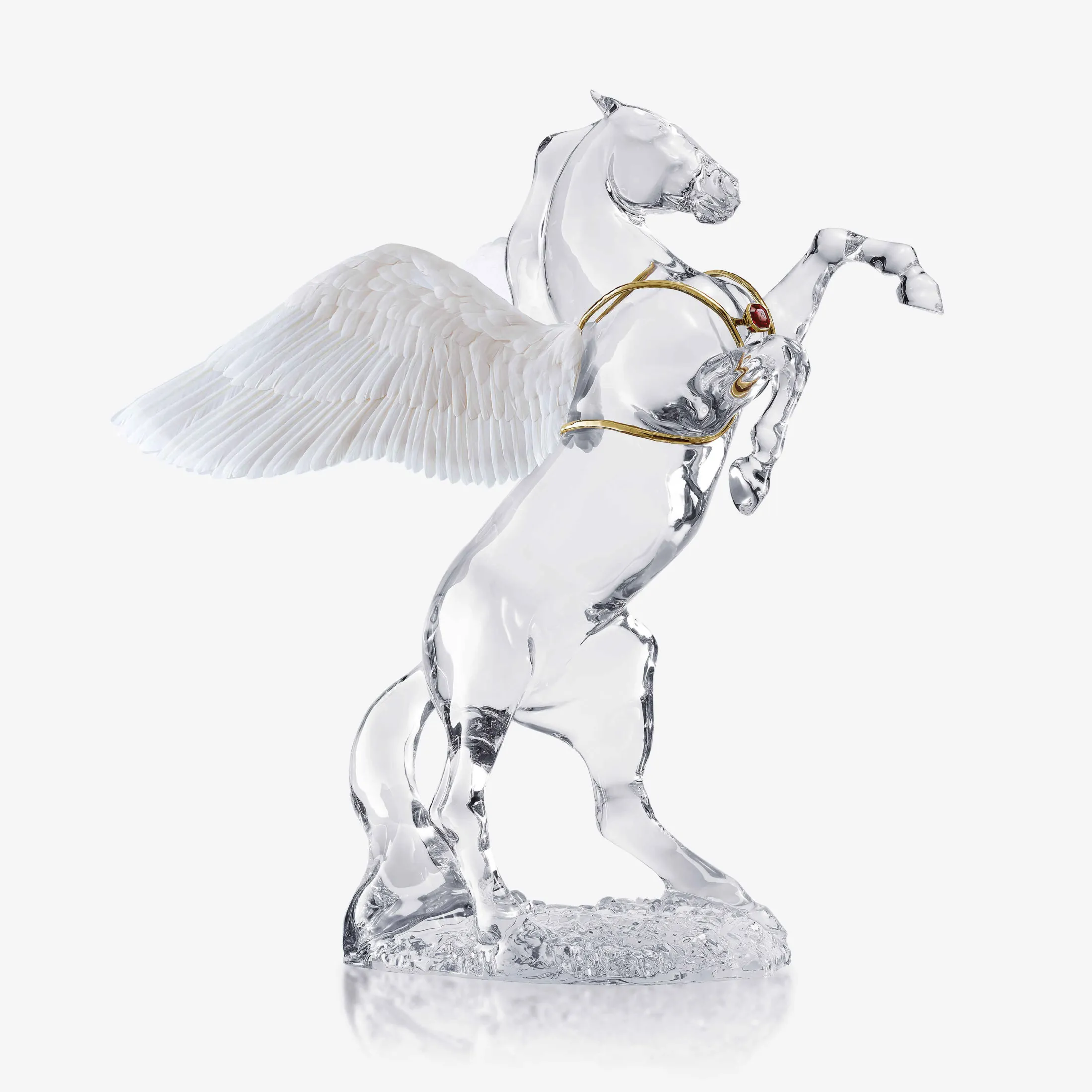 The Olympus Pegasus embodies exceptional French artistry. For this creation, Baccarat has called upon the craftsmanship of Maisons d’art Lemarié and Goossens, with whom it shares a passion for excellence, creativity, and the transmission of savoir-faire. This bold and poetic interpretation of the legendary winged horse takes shape in a spectacular sculpture standing 77.3 cm tall. Captured in a moment of majestic motion, the crystal horse is sculpted from a single block, a technical feat achieved through the prowess of a Meilleur Ouvrier de France and Chevalier des Arts et des Lettres at the Baccarat Manufacture. Drawing on the combined talent of several artisans, each piece requires a unique mold and many hours of hand-cutting to reveal its luminous power. The horse’s wings, fully adorned with real feathers — 290 goose feathers and 330 duck plumes — are the result of the rare expertise of Maison Lemarié. Carefully selected, trimmed, shaped, and individually assembled by hand, the feathers lend the piece an astonishingly ethereal lightness. The supporting armature was entrusted to Maison Goossens, a renowned goldsmith and haute couture jeweler. Dipped in 24-carat gold and delicately patinated, it contrasts beautifully with the brilliance of the crystal and enhances the sculpture’s elegance. Balancing finesse and power, Olympus Pegasus is a vibrant tribute to the gestures of artisans passed down through generations. Ideal for horse enthusiasts and collectors inspired by the Year of the Horse in 2026, this extraordinary masterpiece embodies the vision of those whose dreams know no bounds.